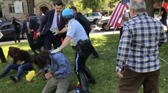Έτσι, μια άνευ προηγουμένου για την διπλωματική πρακτική επίθεση εναντίον διαδηλωτών, συνέβη την περασμένη Τρίτη στην Ουάσινγκτον, έξω από τις κτιριακές εγκαταστάσεις της τουρκικής πρεσβείας. Η αιματηρή επίθεση συνέβη από Τούρκους μπράβους της πρεσβείας, κατά την διάρκεια επίσκεψης του Ερντογάν στις ΗΠΑ, εναντίον Κούρδων διαδηλωτών που είχαν συγκεντρωθεί για ειρηνική διαμαρτυρία. Τα τηλεοπτικά πλάνα είναι πραγματικά αποκαλυπτικά …