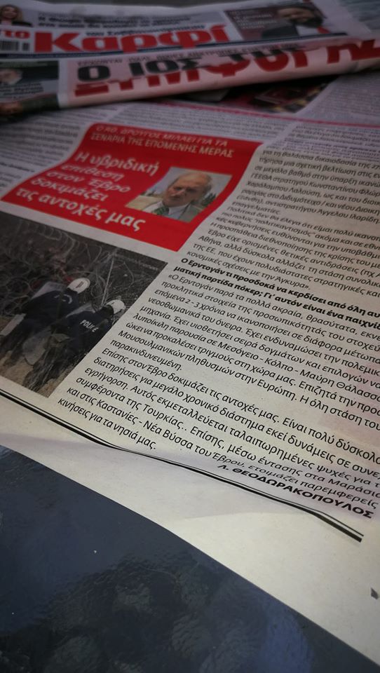 Ο Athanasios Drougos διεθνολόγος και στρατιωτικός αναλυτής απαντάει στην εφημεριδα ΚΑΡΦΙ σε 5+1 ερωτήματα για το τι κρύβεται πίσω από τα επεισόδια στον Έβρο. Εκτιμά ότι οι ύπουλες αυτές κινήσεις από την απέναντι πλευρά στοχεύουν στην κόπωση των ελληνικών δυνάμεων. Διαβάστε την συνέντευξη στην εφημερίδα καρφί για να διαπιστώσετε την αληθινή διάσταση που επικρατεί στα σύνορα μας αυτή την στιγμή!