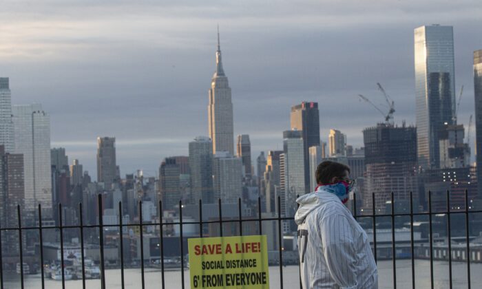WEEHAWKEN, NJ – APRIL 06: A man covers his face as the sun rises behind in Manhattan on April 6, 2020 as seen from Weehawken, New Jersey. The U.S. COVID-19 death toll has now surpassed 9,000. (Photo by Kena Betancur/Getty Images)