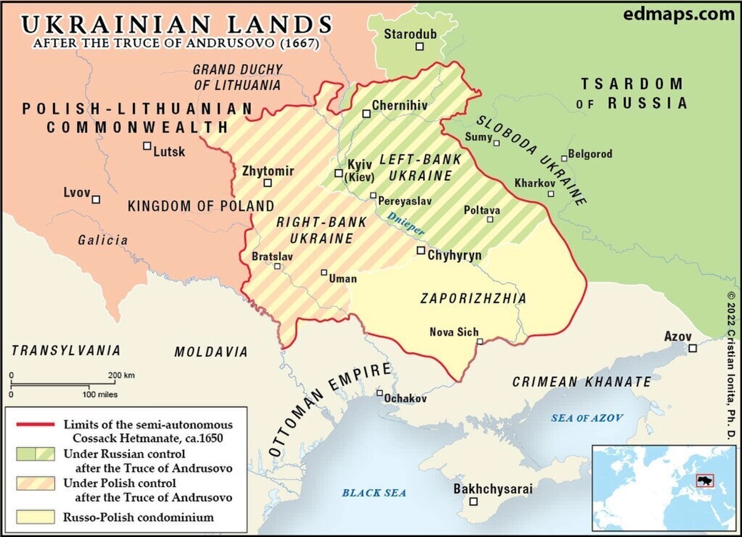 Ένα χαρακτηριστικό παράδειγμα είναι η Συνθήκη του Αντρούσοβο του 1667, όταν ό,τι απέμεινε από το Κοζακικό Χετμανάτε μετά από σχεδόν δύο δεκαετίες πολέμου χωρίστηκε μεταξύ του Τσάρντομου της Ρωσίας και της Πολωνο-Λιθουανικής Κοινοπολιτείας. Τα πάντα στην αριστερή (ανατολική) όχθη του Ντνίπρο, μαζί με το Κίεβο στη δεξιά όχθη, πήγαν στη Μόσχα. Τα πάντα στη δεξιά (δυτική) όχθη (εξαιρουμένου του Κιέβου) πήγαν στην Πολωνία. Τα αραιοκατοικημένα τμήματα γης γύρω από τη Ζαπορίζια, όπου οι Κοζάκοι εξακολουθούσαν να ζουν μάλλον ελεύθερα, κυβερνιόταν από κοινού μεταξύ Μόσχας και Βαρσοβίας ως συγκυριαρχία, που προοριζόταν ως ουδέτερη ζώνη για να κρατήσει τους Τάταρους και τους Τούρκους σε απόσταση. Η συνθήκη υπογράφηκε μετά από χρόνια πολέμου που πυροδοτήθηκε από την εξέγερση των Κοζάκων της Ζαπορίζια του Βόχνταν Χμελνίτσκι το 1648 κατά των καταπιεστικών Πολωνών πολιτικών.Από τον 15ο έως τον 17ο αιώνα, η Πολωνο-Λιθουανική Κοινοπολιτεία βίωσε μια πραγματική έκρηξη εκμετάλλευσης χρυσού καθώς επεκτάθηκαν σε Ουκρανικό έδαφος μετά την υποχώρηση των ορδών της Μογγολίας. Ο χρυσός, ωστόσο, ήταν σιτάρι. Ο Χμελνίτσκι χρησιμοποίησε μακροχρόνια δυσαρέσκεια κατά των Πολωνών και των Εβραίων για να ενώσει τους Κοζάκους ενάντια στην Πολωνική αριστοκρατία.Η εξέγερση, αρχικά επιτυχής αν και ήταν δύσκολο να διατηρηθεί εναντίον ενός ανώτερου Πολωνικού στρατού, ώθησε τους Κοζάκους στη Συμφωνία του Περειασλάβ του 1654, που προσκάλεσε τα Τσαρικά στρατεύματα στην Ουκρανία (και την οποία αρκετοί Ουκρανοί αναφέρουν μέχρι σήμερα.) Με απλοποιημένους όρους, οδήγησε σε τρεισήμισι αιώνες Ρωσικής κυριαρχίας πάνω στην Ουκρανία.Οι συνέπειες είναι σαφείς από το γεγονός ότι εκείνα τα πρώτα χρόνια μετά τη Συνθήκη του Αντρούσοβο έχουν γίνει γνωστές στους Ουκρανούς ιστορικούς ως «Η καταστροφή». Η ίδια εποχή στην ιστορία της Πολωνικής ιστορίας αναφέρεται σήμερα ως «Ο κατακλυσμός».Όσο πιο μακριά στην ιστορία πηγαίνουμε τόσο περισσότερο ακούμε αυτά τα ίδια μοτίβα. Οι Μογγόλοι εισέβαλαν και το 1240 και κατέλαβαν το Κίεβο. Αλλά ακόμη και πριν από τους Μογγόλους, το Κίεβο δεν είχε ακόμη ανακάμψει από την καταστροφή του το 1169 στα χέρια του «αδελφού γείτονά του», του Αντρέι Μπογκολιυφσκι από το Vladimir-Sudzal (η Μόσχα ήταν παρά μόνο ένα χωριό εκείνη την εποχή), που πυροδοτήθηκε από μια διαμάχη επιτυχίας.Πριν ακόμη και οι Σλάβοι εμφανιστούν σε μεγάλο μέρος της επικράτειας που σήμερα είναι γνωστή ως Ουκρανία, οι αρχαίοι Έλληνες εγκατέστησαν φυλάκια στη Μαύρη Θάλασσα για να υποστηρίξουν τη Μάγκνα Γκράνα με δημητριακά και σκλάβους από την ενδοχώρα, σύμφωνα με τον ιστορικό Σέρχιι Πόκχι στις “Πύλες της Ευρώπης: μια Ιστορία της Ουκρανίας”Οι μορφωμένοι Ουκρανοί γνωρίζουν αυτές τις λεπτομέρειες. Αλλά όλοι οι Ουκρανοί έχουν αισθανθεί – και συχνά υποφέρουν – τις επιπτώσεις της γεωγραφικής τους θέσης ως θεματοφύλακες μιας πλούσιας γης εύκολα προσβάσιμης από όλες τις κατευθύνσεις.Η τότε βιασύνη περί του χρυσού μπορεί κάλλιστα να συνεπάγεται ουράνιο, λίθιο και σπάνιες γαίες που πολλοί από αυτούς που διαπραγματεύονται το μέλλον της Ουκρανίας δεν έχουν ακούσει ποτέ. . Αλλά μόνο οι Ουκρανοί αντιμετωπίζουν την προοπτική να είναι ανεπίσημα θαμμένοι στη γη τους γεμάτο πλούτο.ΜΕΡΟΣ Β